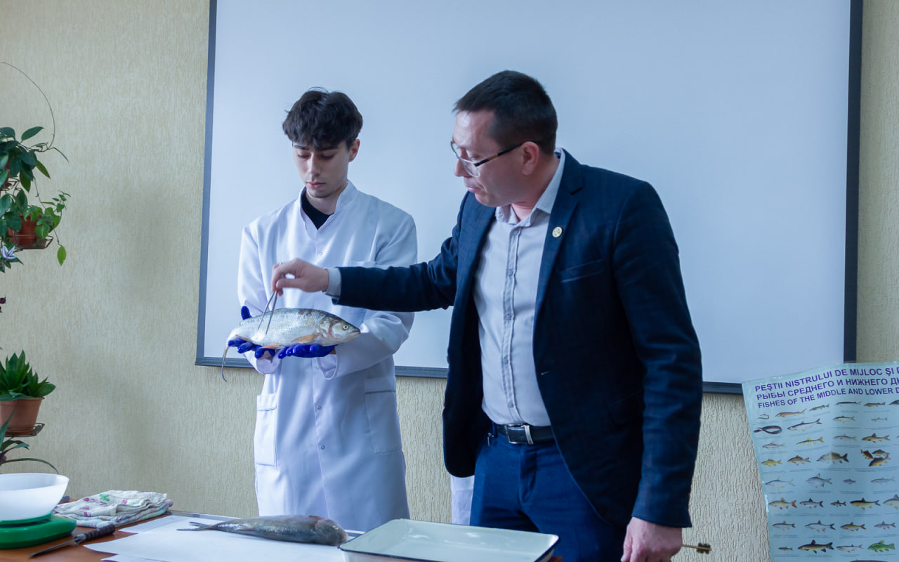 В лаборатории зоологии позвоночных, действующей при кафедре зоологии и общей биологии, кандидат биологических наук, доцент М.В. Мустя вместе со студентами IV курса направления «Биология» провел препарирование леща и жереха. Школьникам продемонстрировали критерии определения видов рыб и представили классификационную таблицу обитателей реки Днестр.